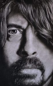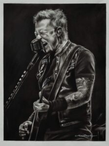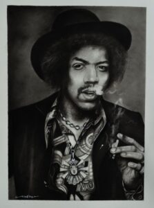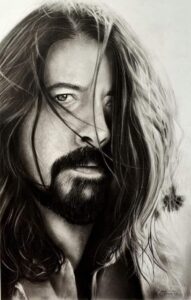 She’s been dabbling in many mediums over the years but her true passion lies in the mastery of realism and hyperrealism through charcoal. She is particularly “drawn” to creating highly detailed, emotionally expressive portraits of musicians.